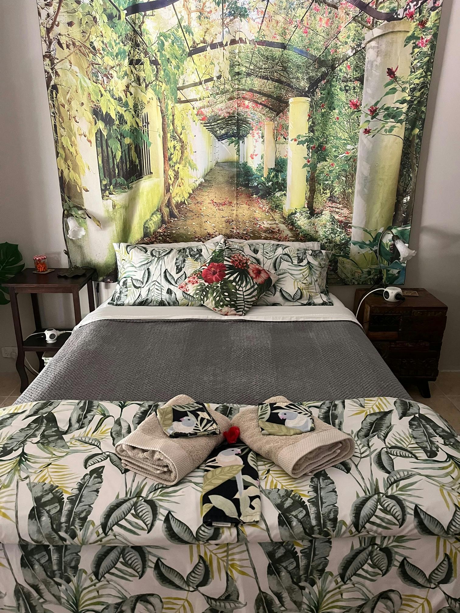 Queen Room is in the middle of the picture hall, has its own private courtyard, kitchenette, lounge & stylish feel of outdoor shared bathroom. Lovely room for extended stay with robes. Something about the room that I always enjoy getting ready for guests, it’s a sweet room.